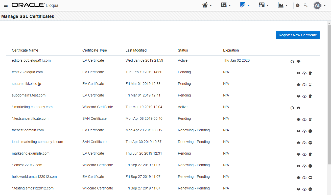 There is clarified language and an updated icon when cancelling a certificate renewal in Eloqua. When a certificate is uploaded containing alt names, it is automatically promoted to a SAN certificate and a notification is shown.