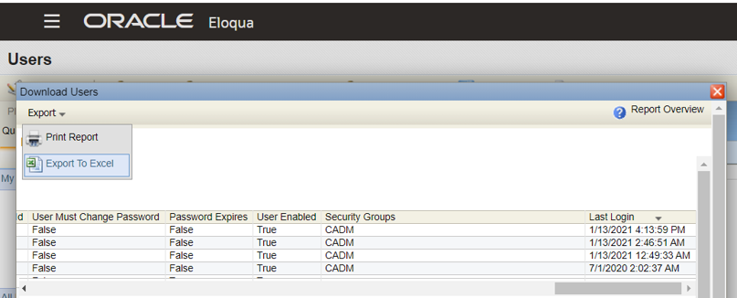 Eloqua user records now include a last login time. You can export the last login time on the user export. Previously, this was only available in the Agent Online History report.