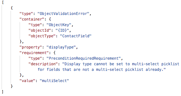 A validation has been added for Application API 1.0 Contact Field endpoints to disallow changing Contact Field type to multi-select picklist.