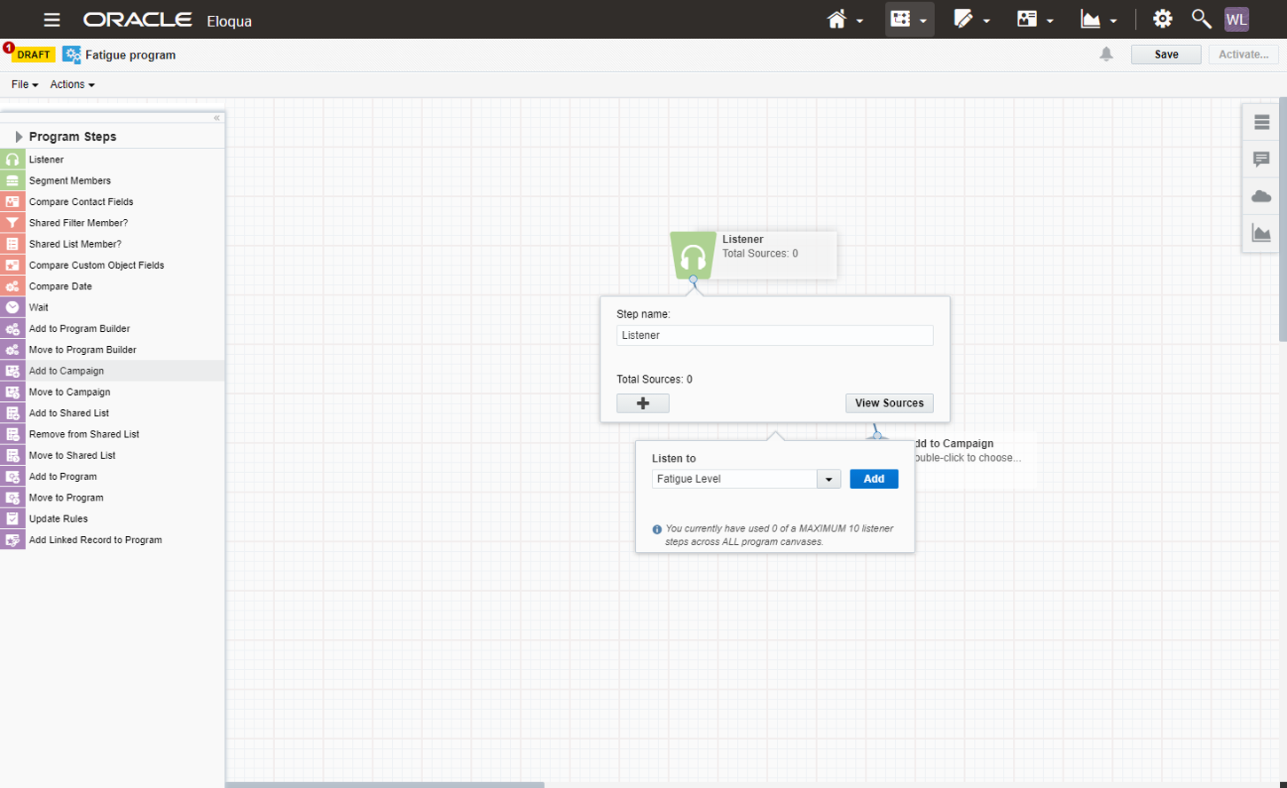 The Fatigue Level contact field can now be used in a listener step in the Program Canvas. This can kick off specific workflows based on a change in a contact's fatigue level.