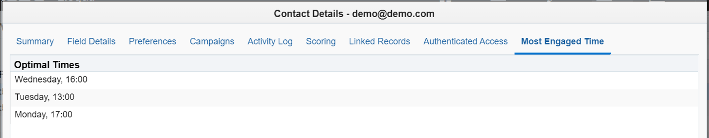 - The Most Engaged Time tab in Contacts now shows the most engaged time in the user's time zone.