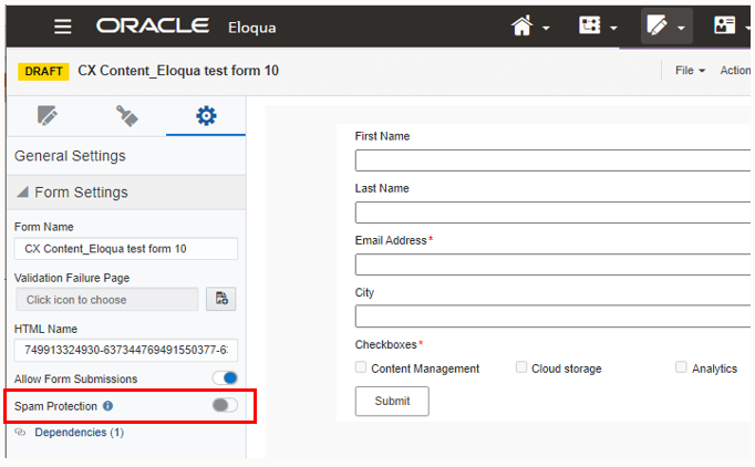 A new option to enable spam protection in form settings is now available. It is supported for forms used on Eloqua landing pages and hosted externally.