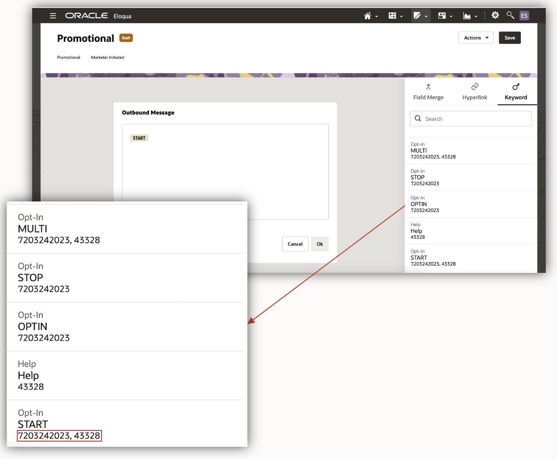 - With the code detail against keywords, you will know the keyword-code linkage and can accordingly pick keywords for the outbound message