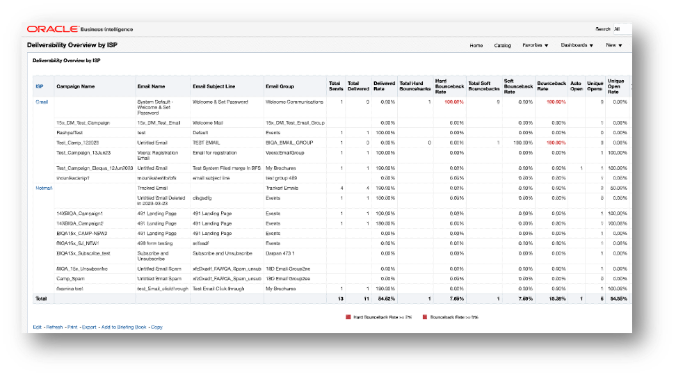 - Hard bounceback and bounceback rates that surpass recommended deliverability thresholds are shown in red