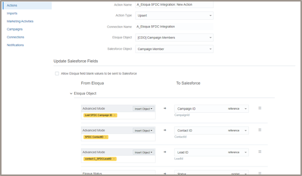 - Integration users can now map/pull CRM IDs from Eloqua Contacts if you use Eloqua Custom Objects to create to campaign members in Salesforce