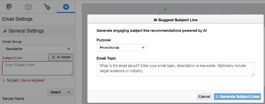 - Generate engaging subject line recommendations powered by AI directly within Eloqua