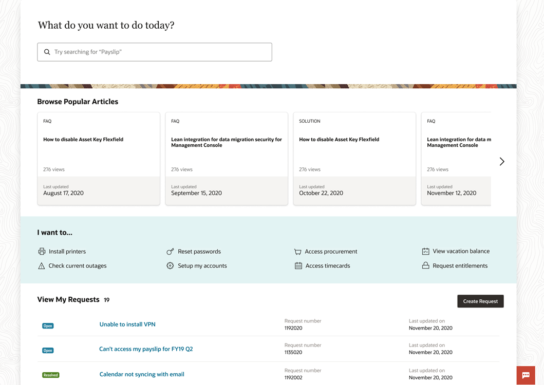 The My Help page, a prebuilt set of pages within the Fusion Application that allows an employee to search knowledge and submit help desk requests. Employees can submit help desk requests about an issue or question, which is then routed and assigned to help desk resources for review and resolution. Employees can also engage with the Help Desk through the Digital Assistant embedded in Fusion applications through the prebuilt skills for knowledge and help desk requests.