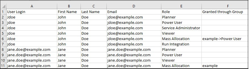 The Role Assignment Report has been modified to include additional information such as the user login, first name, last name, email address, pre-defined and application roles of EPM Cloud users, and how these roles are granted. Previously, the Role Assignment Report listed user logins, roles, and how the roles were granted only.