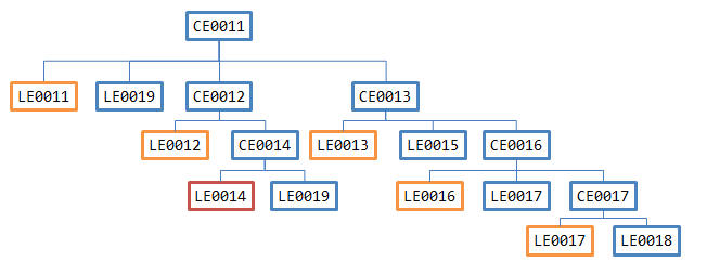 In the example hierarchy shown above, (where LE0011 is the Holding company for CE0011, LE0012 is the Holding Company for CE0012 etc.), LE0014 is a child of a level 1 parent, but is not in the highest generation in scope when CE0011 is consolidated. LE0017 and LE0018 are in scope and in a higher generation (i.e. more levels below the top member). In this case, the elimination entries generated for LE0014 might increment during each subsequent consolidation rather than replace the previous entries.