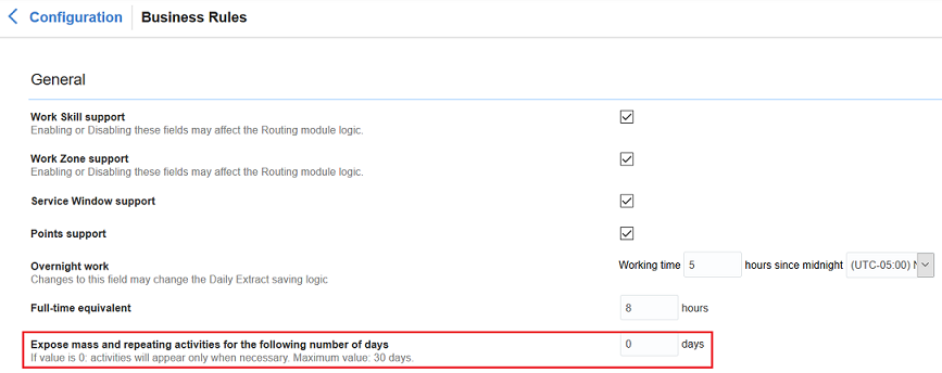 The message "Multi-day activity cannot be assigned within the range defined by Future Days limit"will display as "Multi-day activity cannot be assigned due to missing required work skills, work zones or mismatch of working calendars" now.