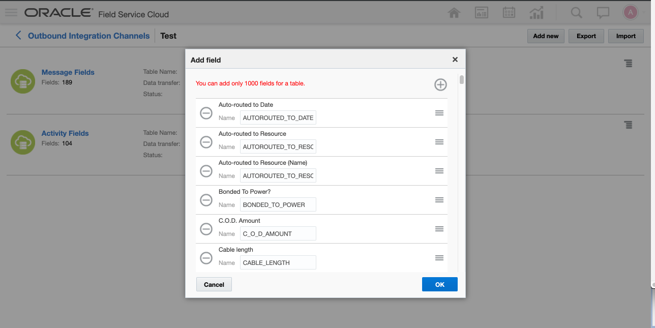 In case of BICS/OACS/DBaaS configurations, the maximum fields you can add for an entity is limited to 1000. If you try to add more fields, the system displays a warning message.