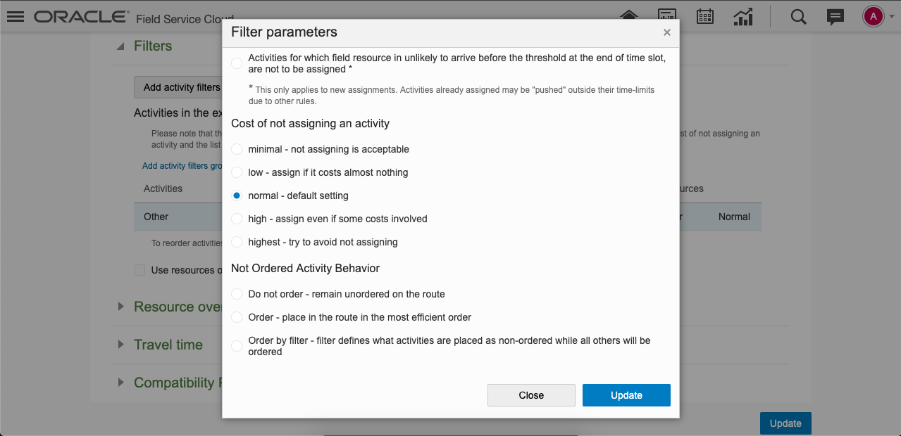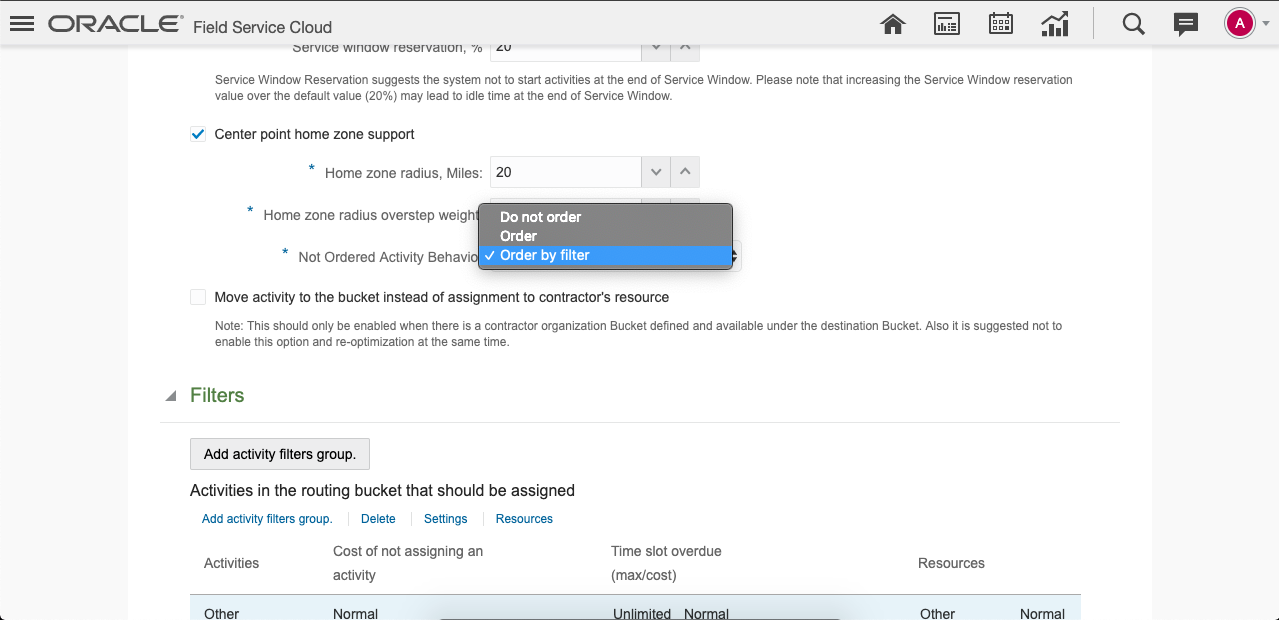 Starting update 19D, the Automatic Ordering feature is renamed to Not Ordered Activity Behavior. In addition to Order or Not Order you can select the Order by filter option in the Not Ordered Activity Behavior field in the Add or Edit Routing Plan dialog. The application places activities without service windows on the route in the most efficient order but does not assign a time slot. In this case, resources decide when to do the work. Not Ordered Activity Behavior can help you complete more activities over the course of the day, but it also reduces the resources’ ability to use their own judgment in completing activities.