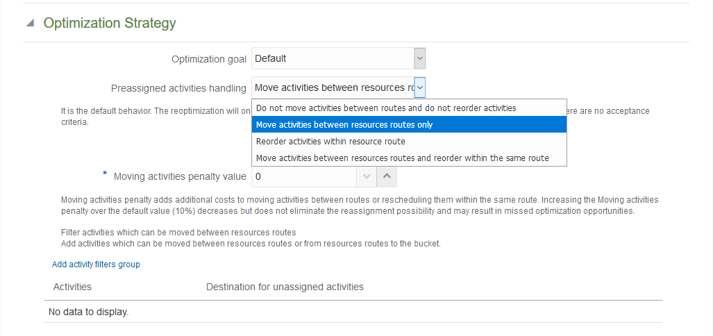 - To manage chances activities being moved within different routes, set the value in the Moving activities penalty value field.