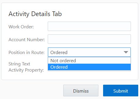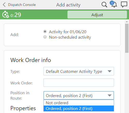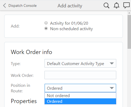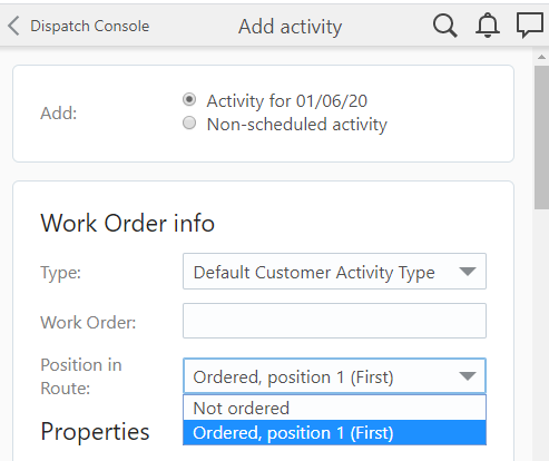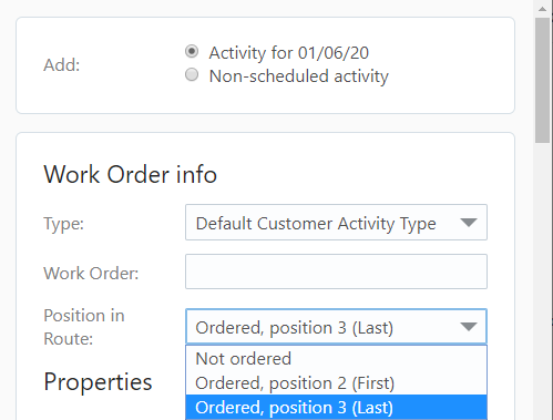 The "afterActivity" value of position field is not allowed, if the date parameter is not empty and is not equal to the date of the currently selected route. Not-ordered activities can be created only for Activity types that have the "Support of not-ordered activities" feature enabled. Default value: { position: "last" } |