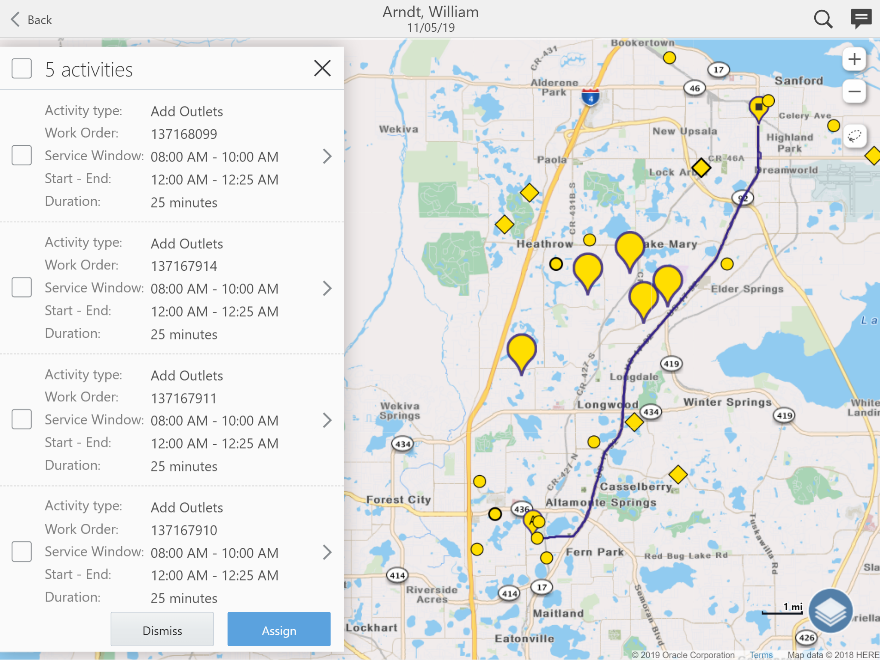 Once activities are routed within a resource's route, the system will try to use better travel estimations between pairs of keys using location services or point to point estimations where the travel was estimated using other methods (expansion, coordinate based only or default). This correction in travel estimation was performed only if the accuracy of the coordinates was provided by the customer during the activity creation or resolved with an accuracy address level or intersection level. With Update 20A, the logic is being updated to include activities where the resolved accuracy is at the street level, route level or zip level.