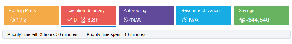 In the Routing screen, click the Executive Summary tab. The Executive Summary section shows the current state of the priority time limits for routing. It displays the high priority time left and the overall high priority time spent in routing across the buckets. More information about the time available can be found in the Unlimited Queued Routing section of the Routing Guide.
