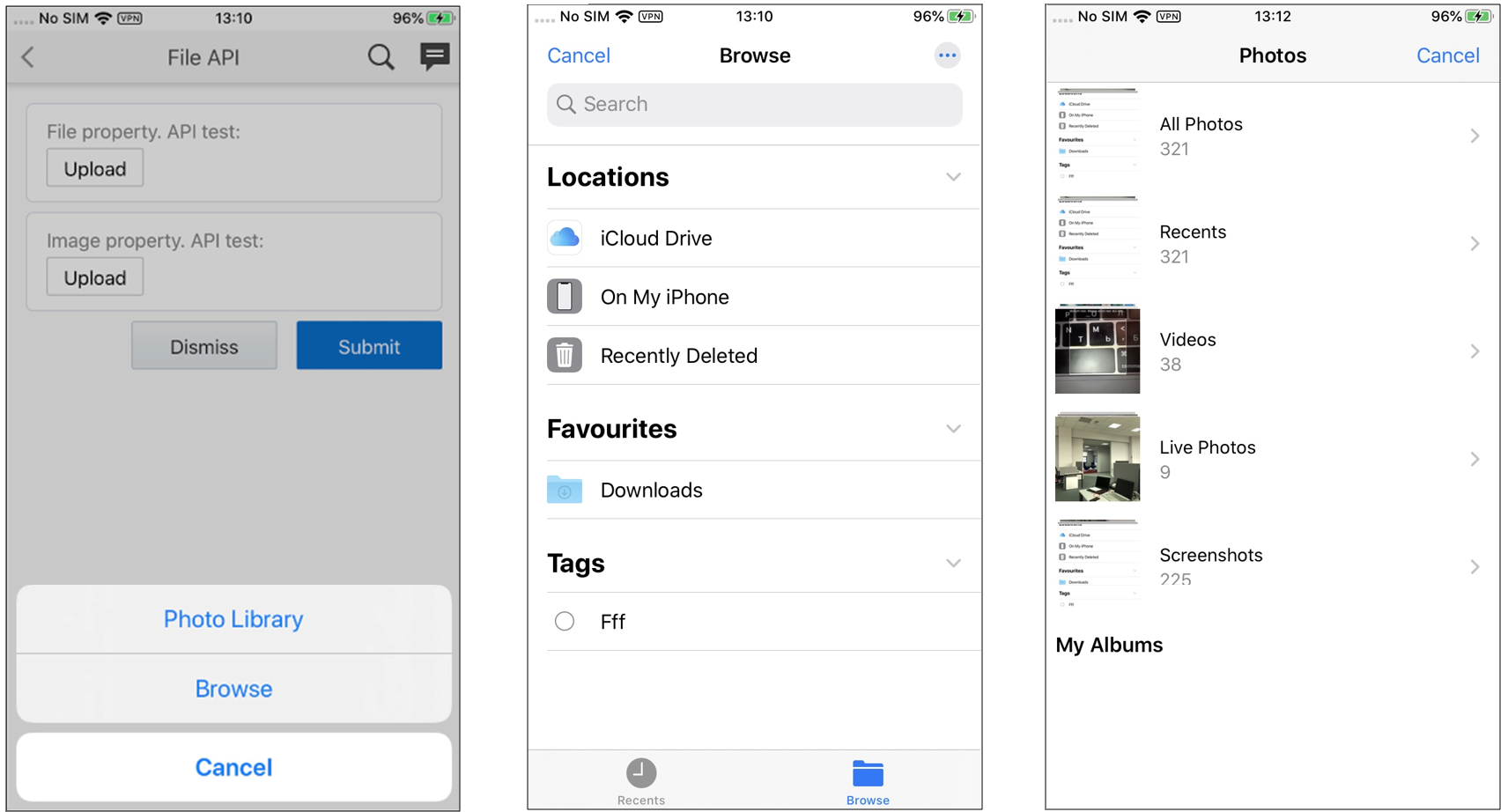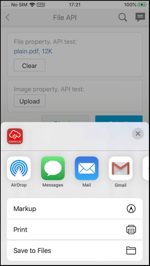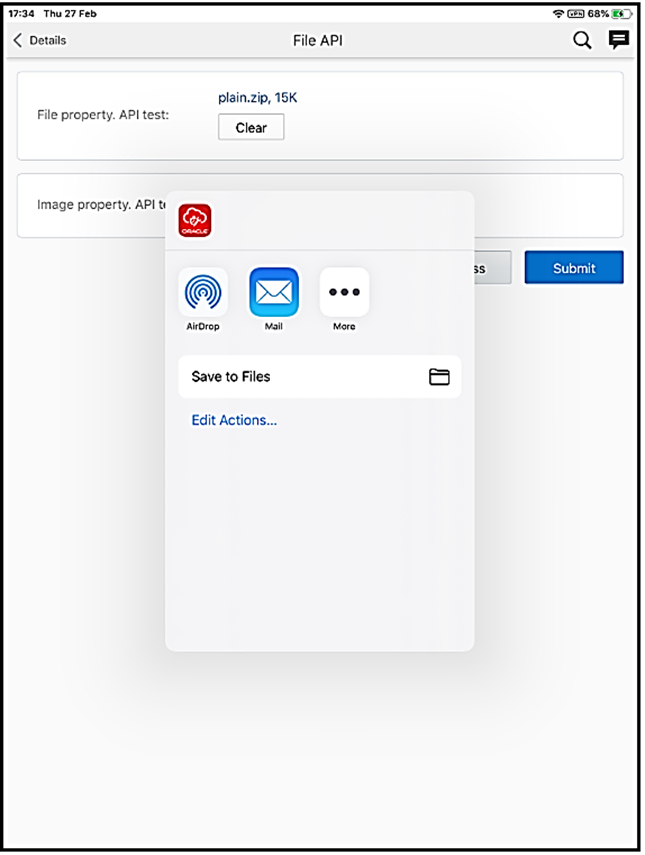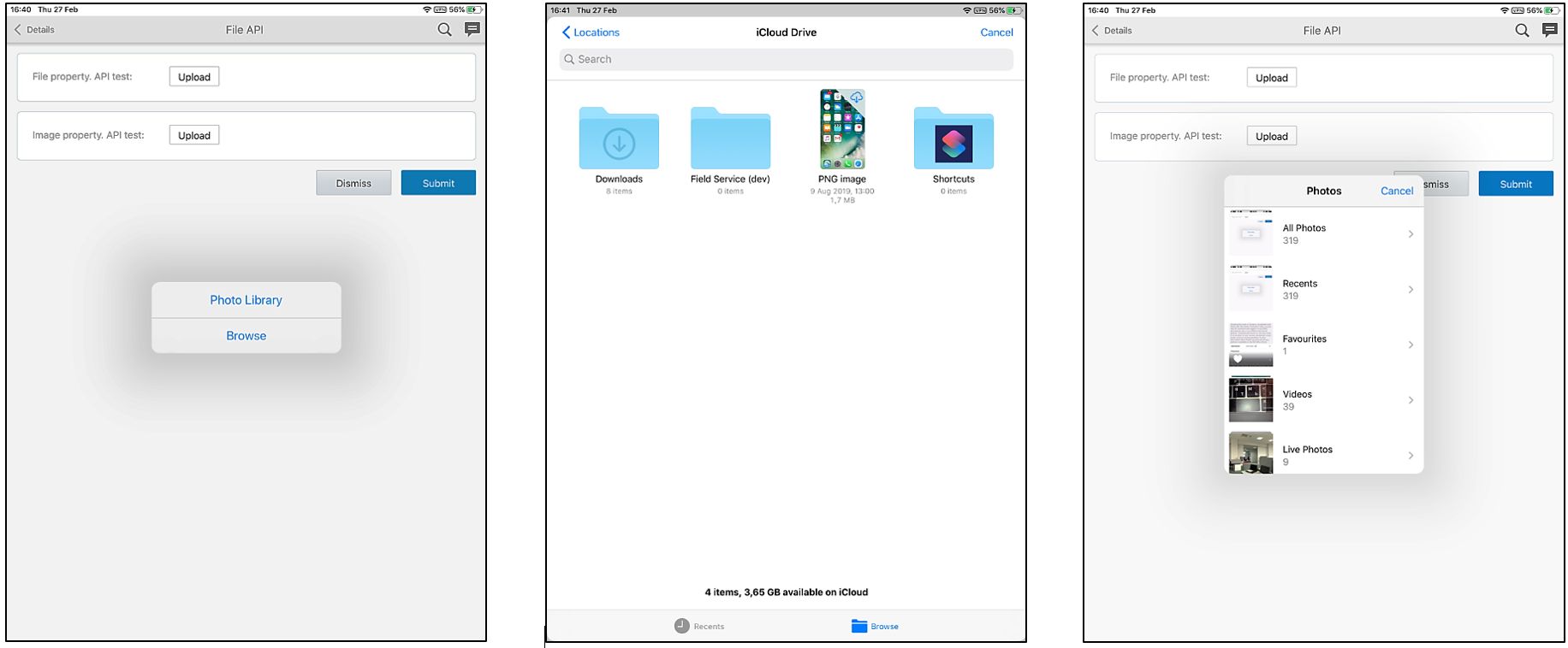 Starting with 20B, based on the operating system version and the third-party software you have installed, you can select the file location and upload files to Oracle Field Service from the photo library or a third-party storage device using the file property.
