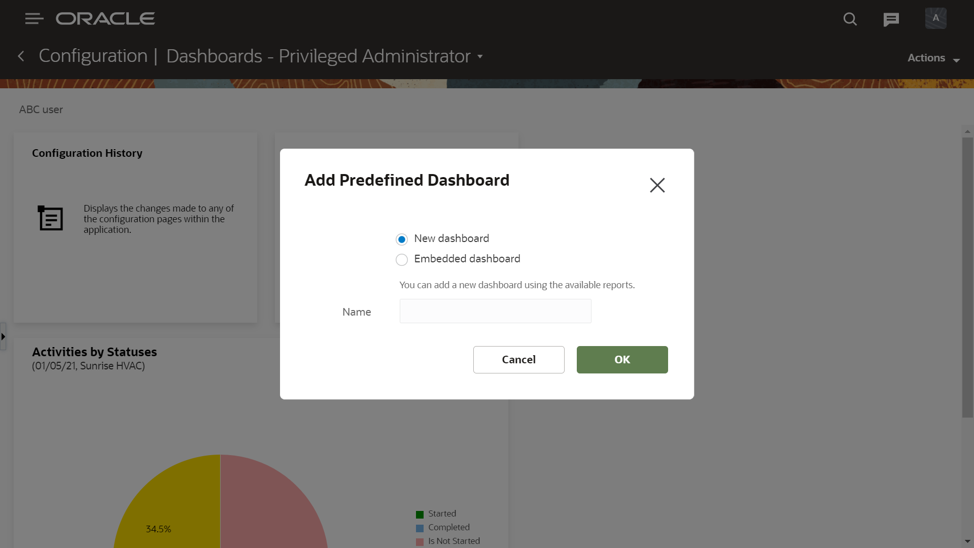 - Add new predefined dashboard dialog box