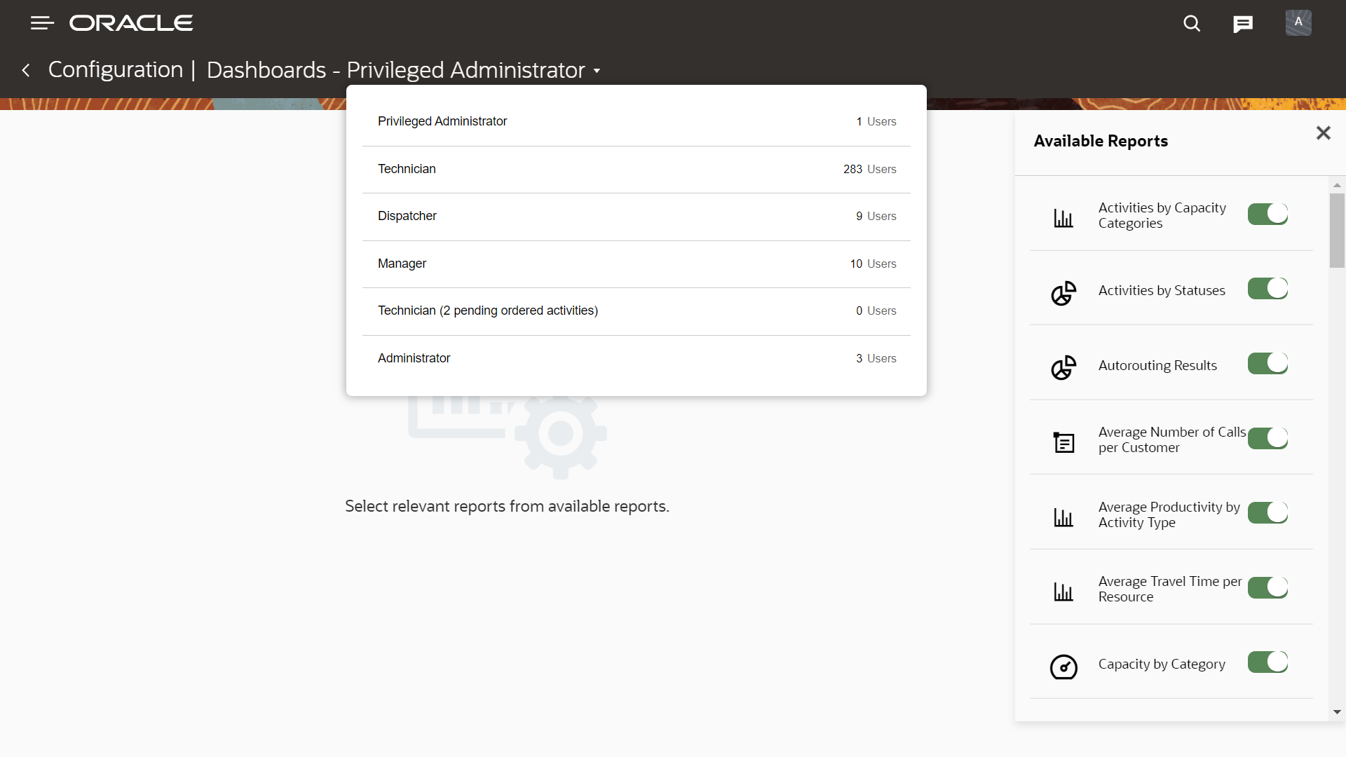 - Dashboard configuration page (Available report selection & User type )