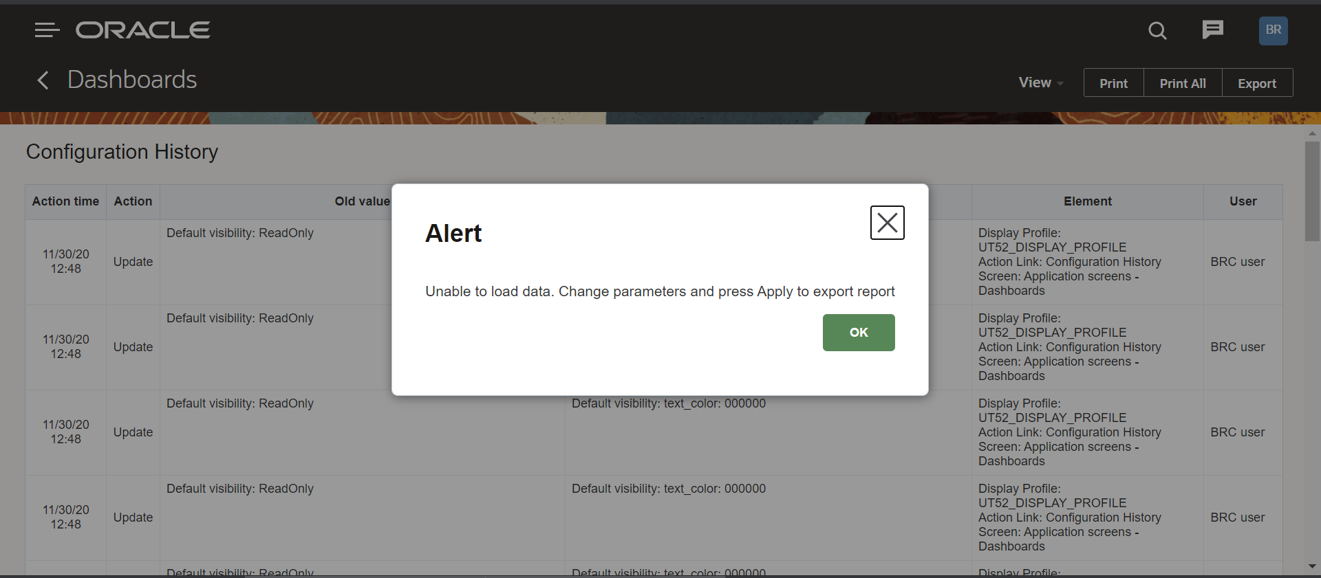 When the user tries to export a report with more than 25,000 records, a warning message "Unable to load data .Change parameters and press apply to export report" appears.