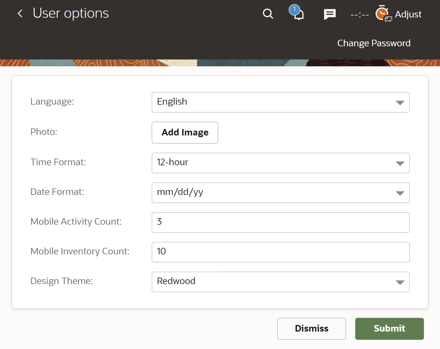 Result: The page background and the 'Submit' button colors are applied to the pages that are mainly used by field resources, such as 'Activity details, 'Inventory details', 'Activity list', and forms. The colors won't be shown on these groups of pages: