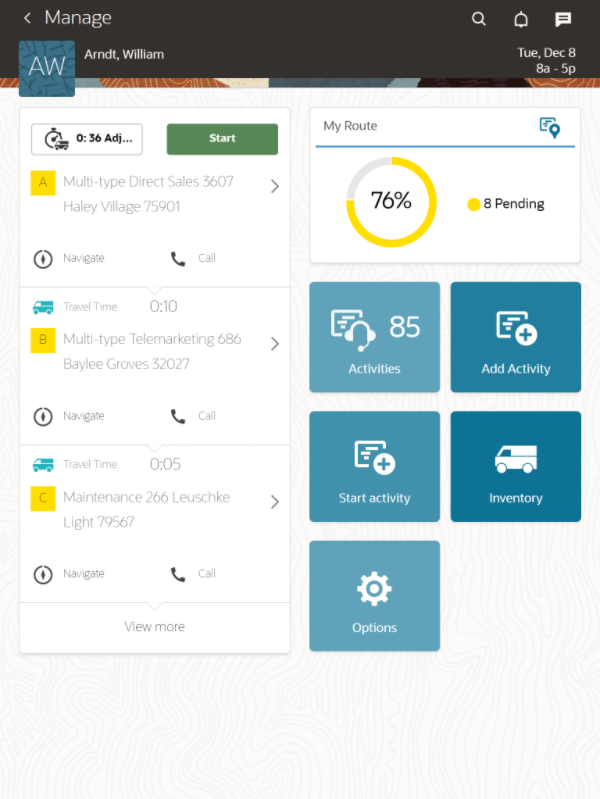 - Click Submit. The number of activities displayed on the landing page includes the Started and Pending activities scheduled for the day. If the number of activities you have is greater than the configured number, the View more link appears on the landing page. This image shows the landing page with the View more link: