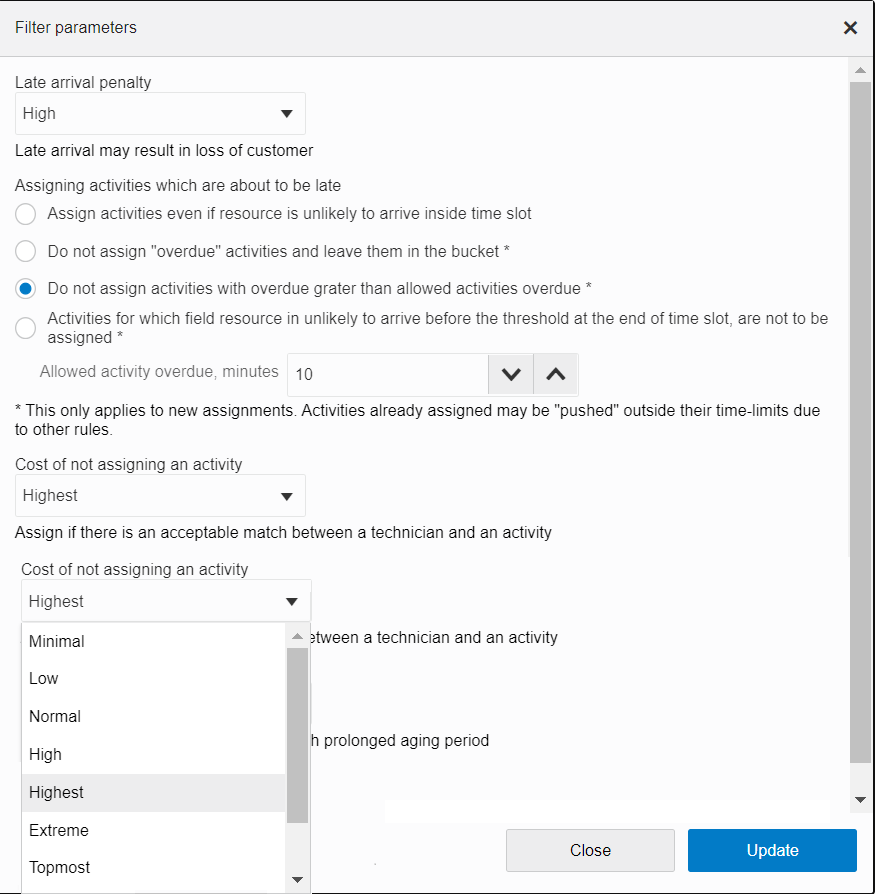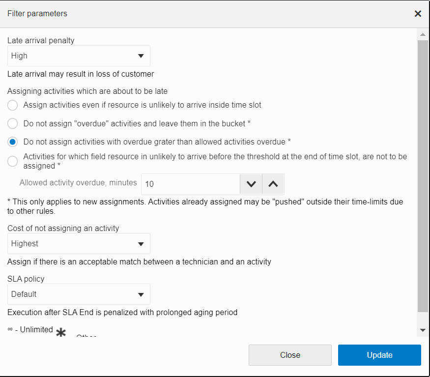 Earlier, only one penalty-driven SLA was available for SLA treatment. Starting with update 21A, four additional SLA policies are available for routing to be set up on a filter level. With Default policy, you may prefer to ignore SLA, reduce SLA aging, place activity as late as possible within SLA window or prefer to not route activities out of SLA window. To support more SLA policies, four additional Non Assignment Costs for activity is added and maximum Center Zone cost may now be up to 999 999.