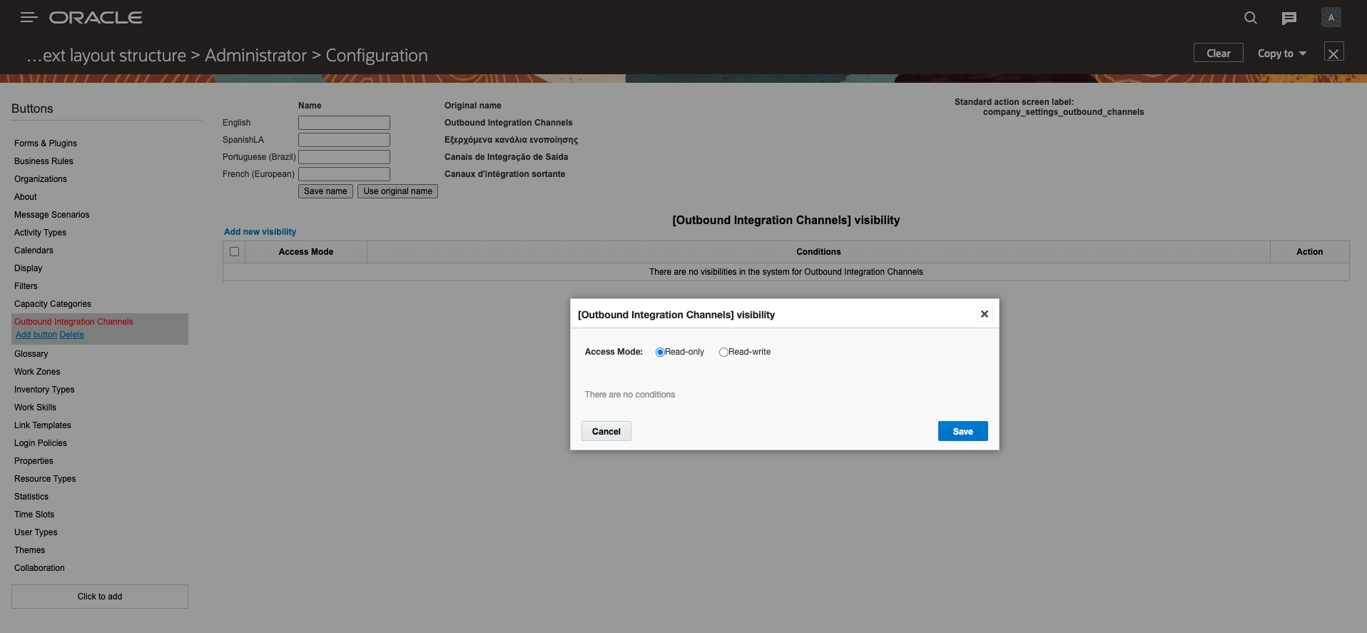 - Navigate to Configuration, Screen Configuration, Outbound Integration Channels.