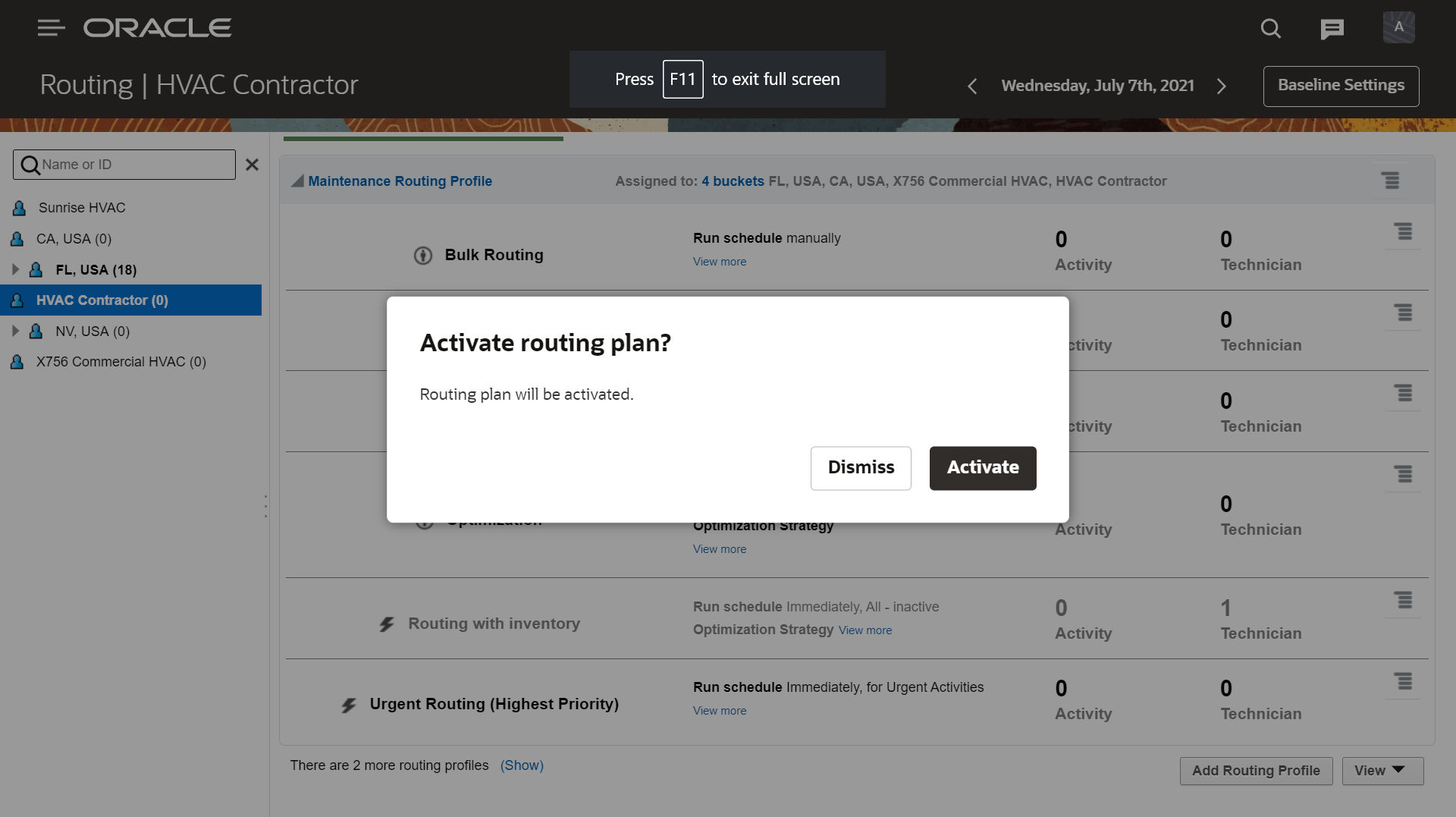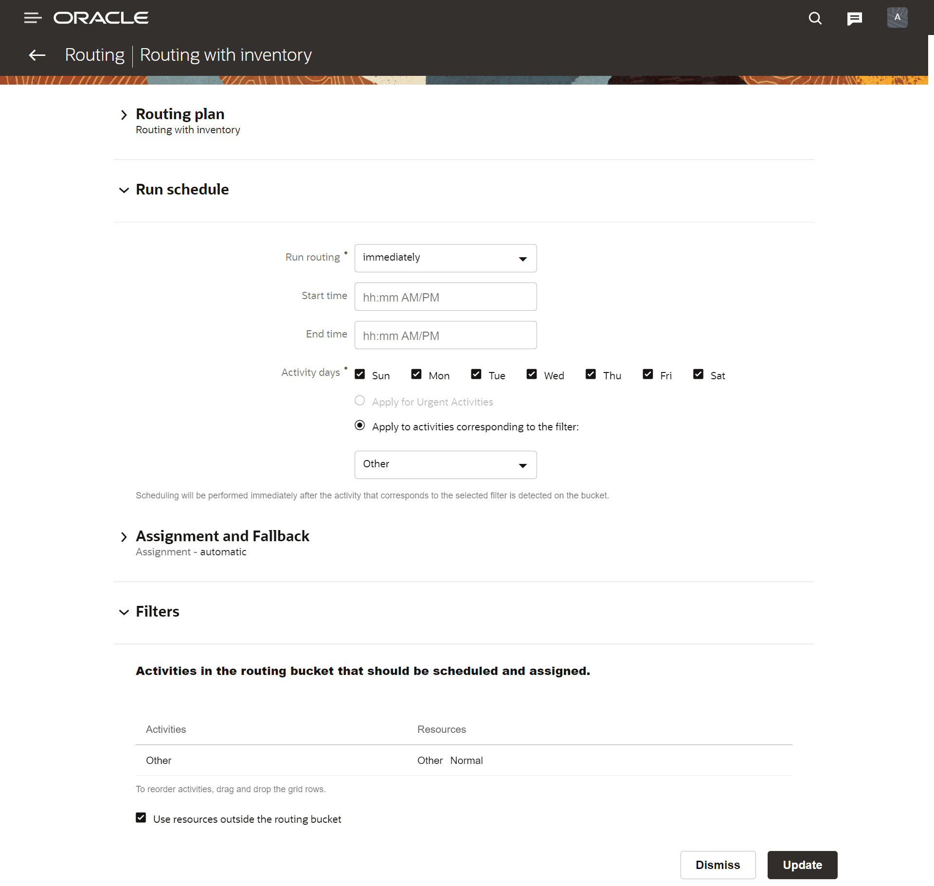- Ability to choose days of week for Immediate Routing Plans and for activities which fit the filter. This is to define specific business rules for immediate activities based on specific days such as, working and non-working days.