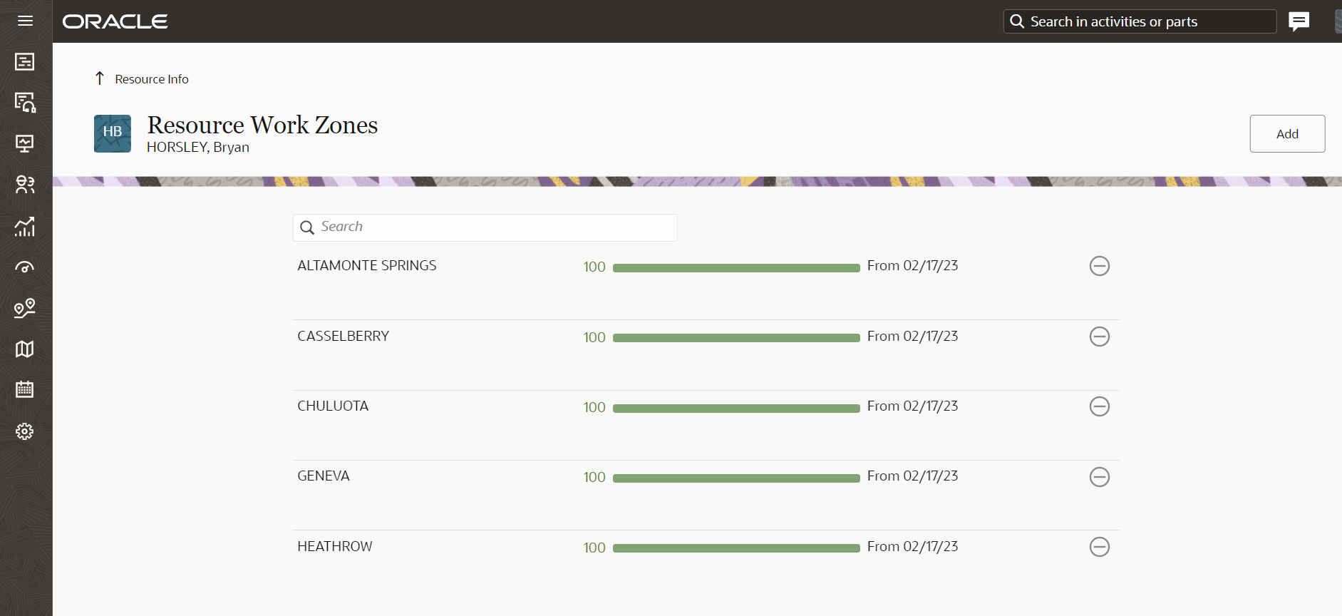 In cases when resources have work zones added but shapes are not populated, or no work zones are added either for resource AND all parents, then the Map on the resource work zones screen will no longer display. Only the list of work zones will be displayed on the full screen. After adding new work zones that have shapes, then the screen is refreshed and the map is displayed.