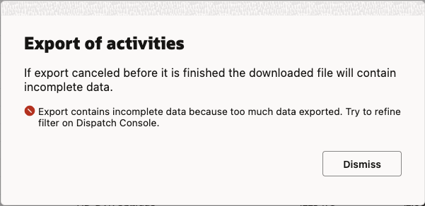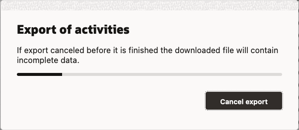 There is also an option to cancel the export, if necessary. The file that contains partially generated data (for example, 500 activities out of 10,000 activities) is still downloaded when the Cancel Export button is clicked.