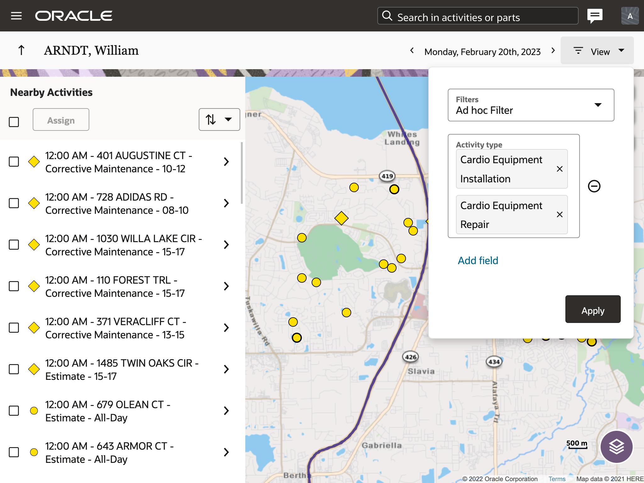 The nearby activities workflow has been improved with the addition of both pre-defined and ad-hoc filtering capabilities. A "View" button is available when the Nearby Activities map layer is enabled within the Route Map. The filters control is consistent with the Dispatch Console.