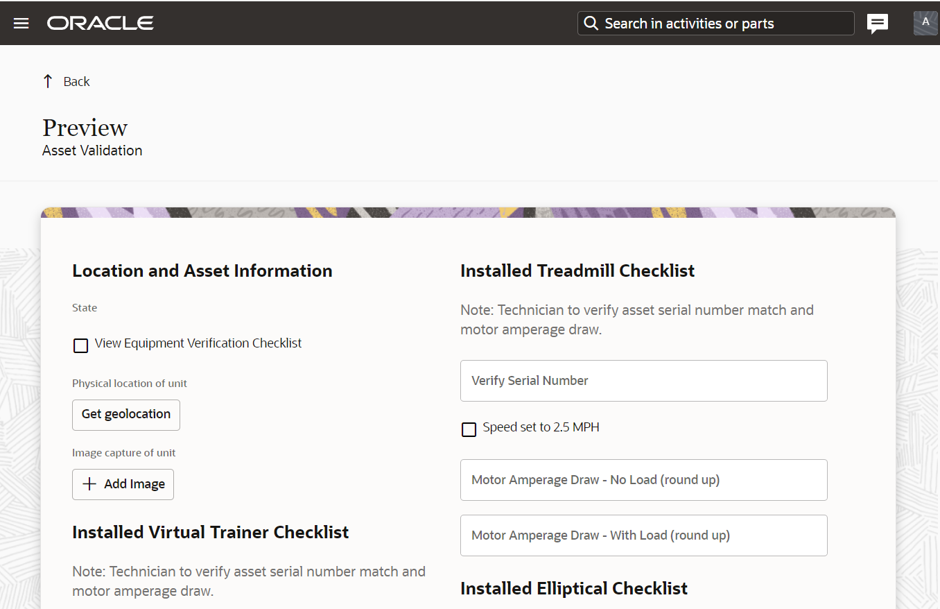 The page header becomes smaller and sticks at the top of the page while scrolling within activities, inventory and forms. When compressed, the back navigation as well as the configurable action buttons remain accessible. This behavior only occurs when using larger devices with screens that are at least 1440 pixels.