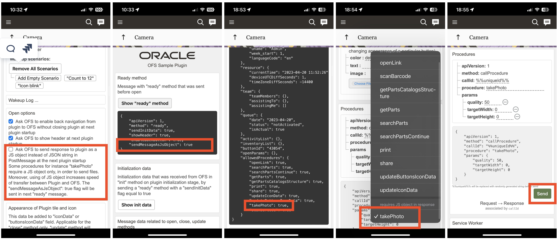 Example of the calling of the "takePhoto" procedure with params: (Plugin -> OFS)
