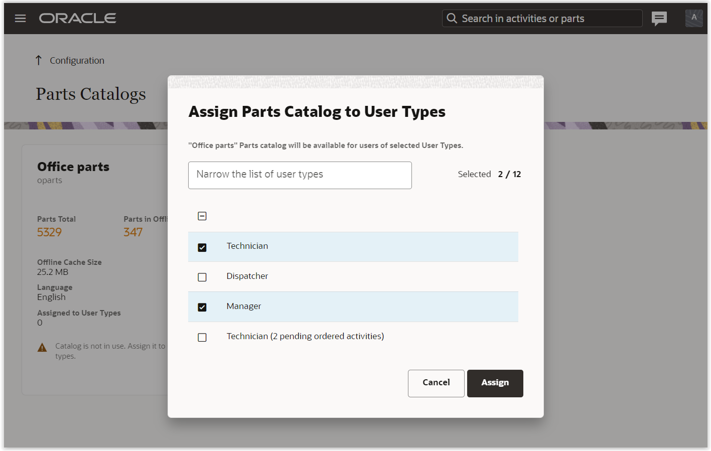 You can now assign each parts catalog to specific user types to ensure that users of those types have access to only the necessary catalogs. This allows you to define which catalogs are required for each user type.