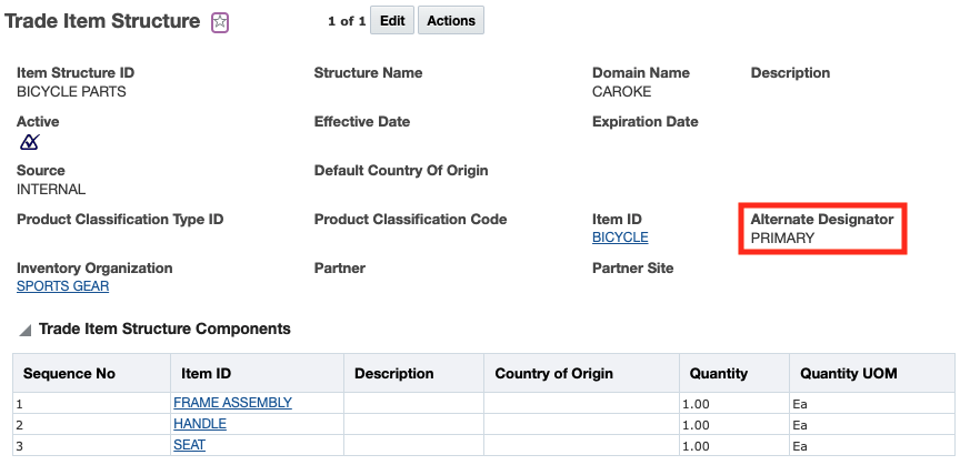 In addition, a new parameter called DEFAULT TRADE ITEM STRUCTURE QUANTITY QUALIFIER has been added to the Logic Configuration Type = GTM LOGIC CONFIGURATION. When qualifying a finished good item with a multi-level BOM, the item is qualified with respect to the leaf nodes of all the sub-assemblies or intermediate structures. The intermediate structures of each component is identified based on inventory organization, item, and alternate designator. This parameter is used to consider the quantity qualifier that will determine the quantity of each intermediate structure.