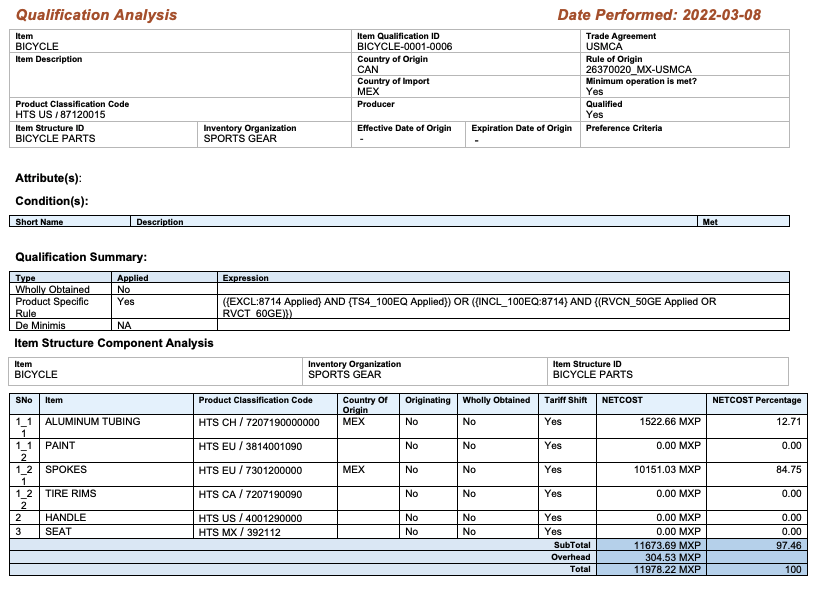 As in previous releases, the Qualify for Trade Agreement action is available from various item-based objects. This action now uses the Alternate Designator field in the qualification process. In the Qualification Report, you can see each of the lowest level components that were analyzed.
