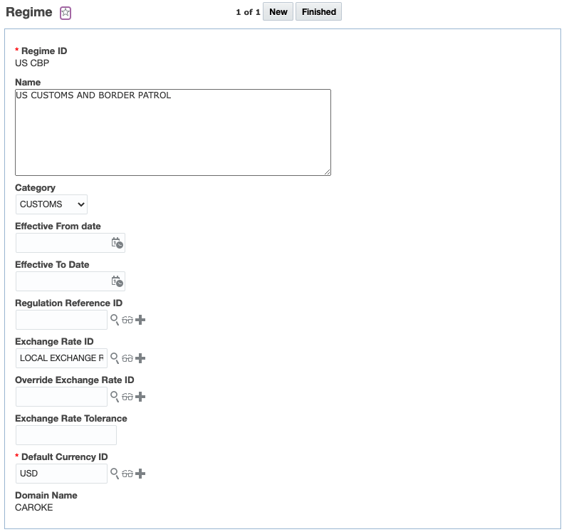 - Regime ID - the regime for a particular jurisdiction related to the customs regime. This is a required field.