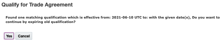 When you trigger the Qualify for Trade Agreement action, GTM will determine if there is an existing qualification record based on the Trade Agreement, Country of Origin, and Country of Import specified. If so, GTM will prompt you with a message confirming if you want to expire the existing record.