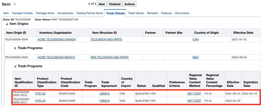 Qualifying for trade agreements enables you to see if a finished good can take advantage of a reduced duty rate. By automating this process for various GTM objects, you can proactively determine if these objects, and the corresponding item, qualify for trade agreements and help your customers save money on duty and tax.