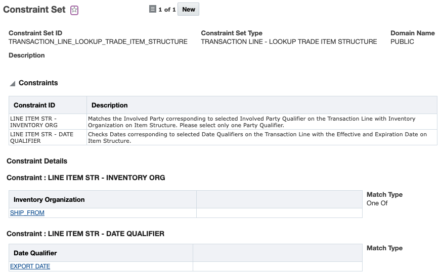 This feature enables GTM to determine the proper trade item structure to use for qualification. A new constraint set called TRANSACTION LINE - LOOKUP TRADE ITEM STRUCTURE is available. This constraint set matches data on the trade transaction line with data on the trade item structure associated with the transaction line item to determined which trade item structure to use. You can specify the data which you want to use for matching including inventory organization, supplier, supplier site, dates, reference numbers, remarks and flex field attributes. For example, you may want to match: