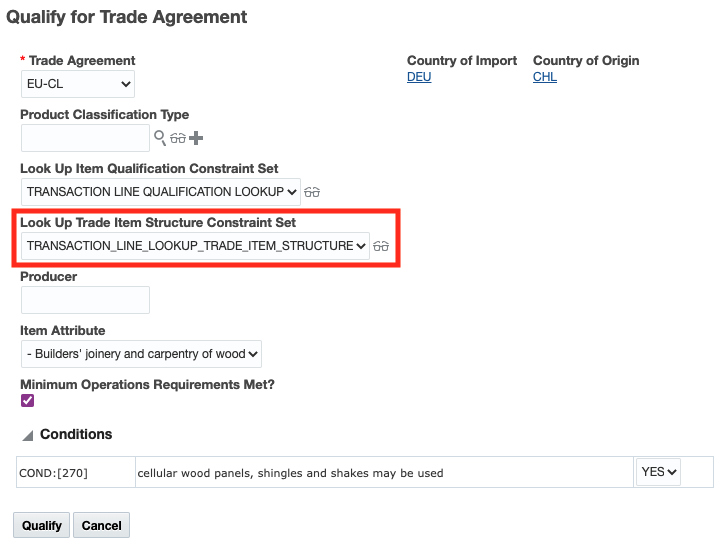 This feature enables GTM to use the Qualified status on the item qualification as part of the qualification logic. In addition to using the rules of origin and wholly obtained flag to determine qualification for a trade agreement, GTM verifies that the Qualified status of the components is set to 'Qualified'. This ensures that all the components from within the trade agreement countries/regions for a bill of material have the supporting certificates of origin and other data from suppliers and have been marked as 'Qualified'. Currently, this feature supports rules of origin rule types such of tariff shift, HS inclusion and HS exclusion.