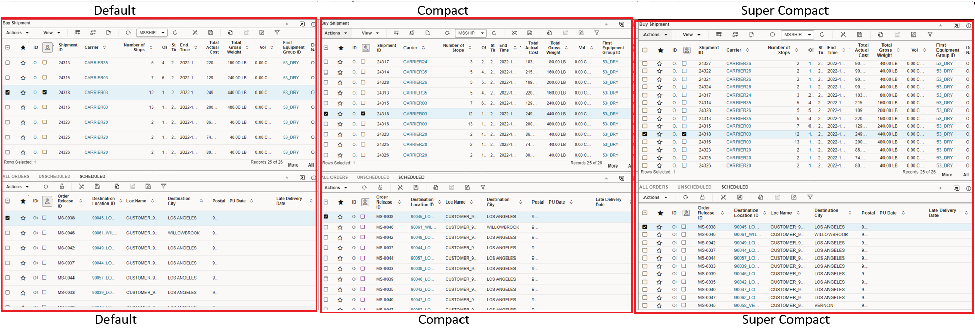 Side by side comparison of the different options. The Super Compact option provides visibility to about twice the number of rows of data when compared to the Default layout.