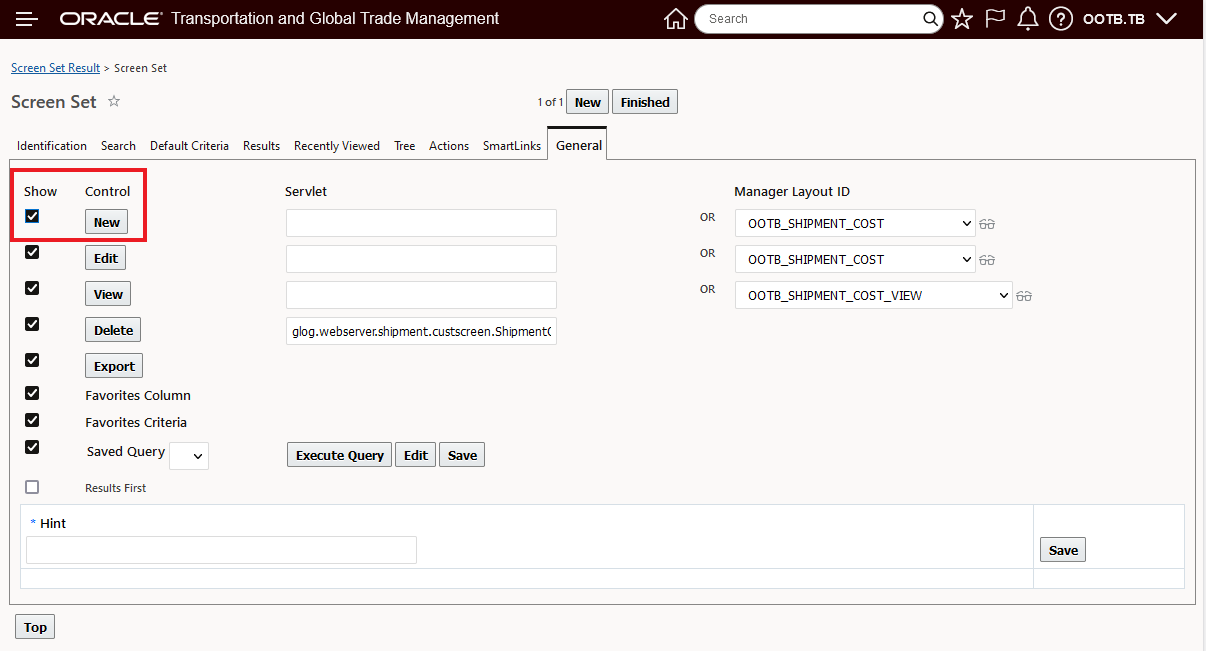 Screen Set for Create New - Show checkbox for the Control New option is selected