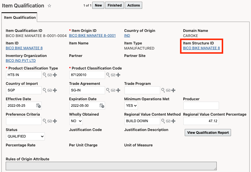 - Item Structure Component Analysis - Displays the finished good and the first level components of the bill of material. It includes details such as Sequence Number, Item, Quantity, UOM, Extended Cost, Value Add, Country of Origin (COO), Wholly Obtained, Tariff Shift, Qualified, Originating, and Value of Originating Material (VOM).