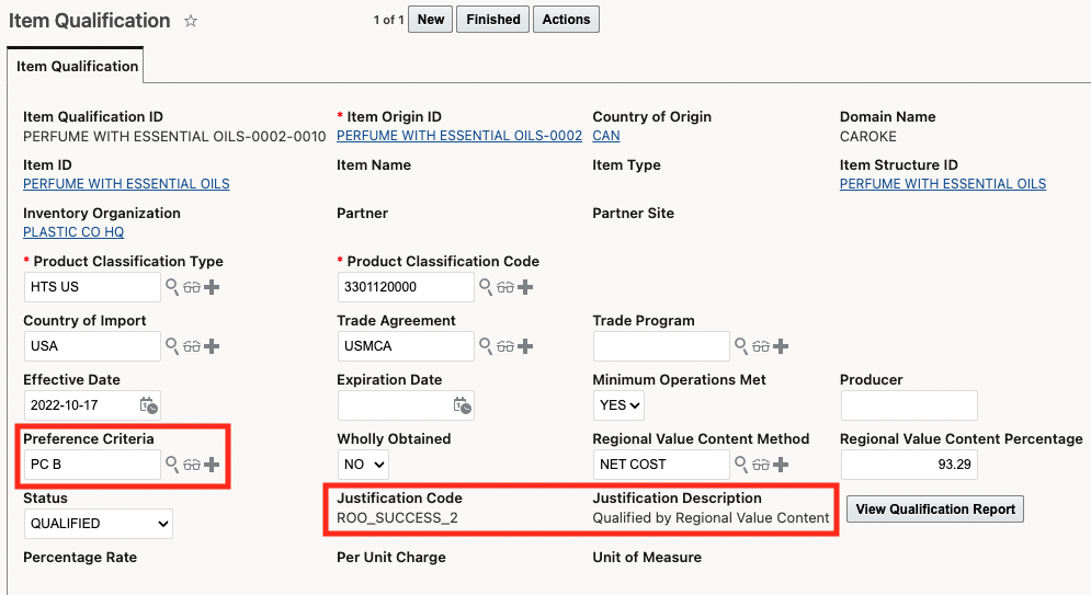 For users of trade agreement qualification, additional fields have been added to the Item Qualification finder results. The Percentage Rate and Per Unit Charge have been added so that you can easily see this information for an Item Qualification in the finder results and the Item Workbench.