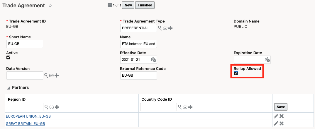 Not all trade agreements support the roll-up principle. For those that do, you can flag the trade agreement using the Rollup Allowed checkbox to indicate that is it supported. Once you've flagged that a trade agreement supports the roll-up principle, the logic will treat the intermediate sub-assembly as 100% originating if the origin criteria in the rules of origin has been met.