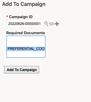 You can now add standard documents when running the Add Items to Campaign action. The Required Documents field has been added to the action when triggered from the following objects: