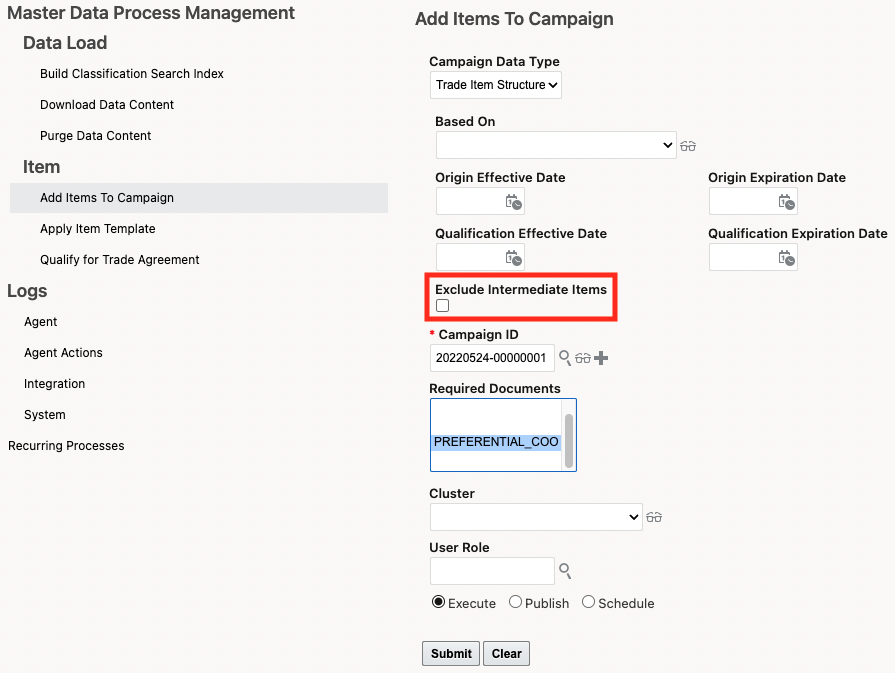 When running the Add Items to Campaign process within Process Management, you can exclude intermediate items so that they are not added to the campaign. This ensures you are creating campaigns with the correct set of items. The 'Exclude Intermediate Items' checkbox is available when the Campaign Data Type = Trade Item Structure.