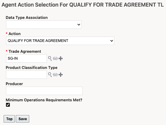When you set up your automation agent, select an Action = QUALIFY FOR TRADE AGREEMENT. You can specify: